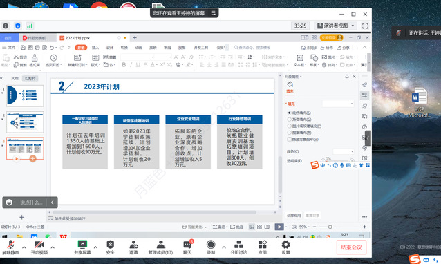 会上,王朔同志首先带领大家又一次回顾了校第二次党代会精神以及任务目标。接着,针对任务目标中的涉及我们部门的主要任务指标:“社会培训:年培训收入超过2000万”,王朔同志分别请各项目组负责人结合2022年度完成的各项工作及指标,为全体成员汇报了2023年度本项组的规划及下一步工作设想做。
