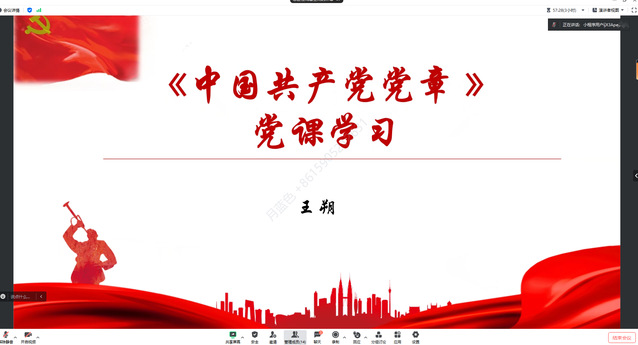 为扎实开展学习贯彻习近平新时代中国特色社会主义思想主题教育,引导党员全面理解党的纲领,牢记入党誓词,牢记党的宗旨,牢记党员义务和权利,督促每位党员进一步尊崇党章、遵守党章、维护党章。2023年10月13日,公司党支部召开专题党课学习,再次学习《中国共产党章程》。会议由党支部书记王朔组织,所有党员同志通过线上集中学习形式参加了此次学习会议。