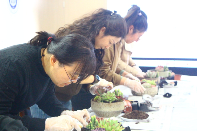 在DIY种植环节,老师们变身巧手花匠,挑选品种、移植花盆、小心地往盆里面添加泥土,再把各种多肉放进去……大家忙得不亦乐乎,完全沉浸在自我创作、欣赏之中。不一会儿,一盆盆各具特色的“纯手工多肉盆景”呈现在大家的手中,看着自己的作品,每个人脸上都露出了满意的笑容。